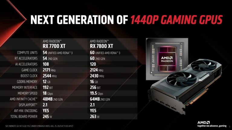 AMD потвърждава, че няма да има референтен модел за RX 7700 XT, въпреки че е наличен рендер за маркетингови цели. Само RX 7800 XT ще се предлага с новия охладител с двоен вентилатор, докато RX 7700 XT ще се предлага ексклузивно чрез партньори на AIB. Освен това AMD потвърждава, че както RX 7800 XT, така и RX 7700 XT ще поддържат DisplayPort 2.1.