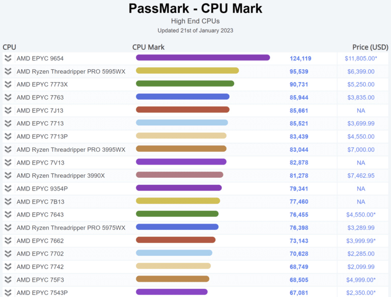 Първият процесор на AMD „Genoa“ вече е включен в класацията „High End CPU“ на PassMark. EPYC 9654 е 96-ядрен процесор със 192 нишки, базиран на най-новата Zen4 архитектура на AMD. В момента това е водещият EPYC процесор на AMD.