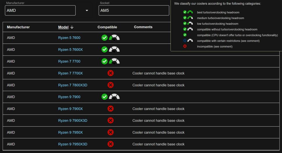 Въпреки това трябва да предупредим читателите, че коментарът на главния изпълнителен директор относно използването на NH-L9a-AM5 на Ryzen 9 7950X или 7900X е извън официалната спецификация. Екранната снимка по-долу показва, че онлайн центърът за съвместимост на Noctua предупреждава, че тези процесори са „несъвместими“ с новия нископрофилен охладител, тъй като „охладителят не може да се справи с базовата му честота“.