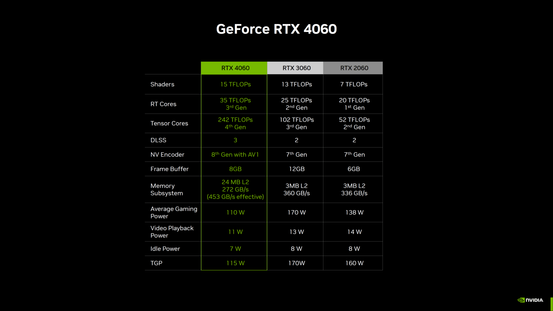 За GeForce RTX 4060 се очаква NVIDIA да използва графичния процесор AD107-400-A1, напълно активираната матрица AD107 Ada. Имайте предвид, че същата конфигурация се използва от GPU за лаптоп GeForce RTX 4060. Очаква се чипът да разполага с 3072 CUDA ядра и 8 GB GDDR6 памет, работеща при скорост на паметта 17 Gbps през 128-битов шинен интерфейс. Това дава на картата 272 GB/s честотна лента, което е ефективно оценено на 453 GB/s или 26% повече от RTX 3060. Това е всичко благодарение на 24 MB L2 кеш.