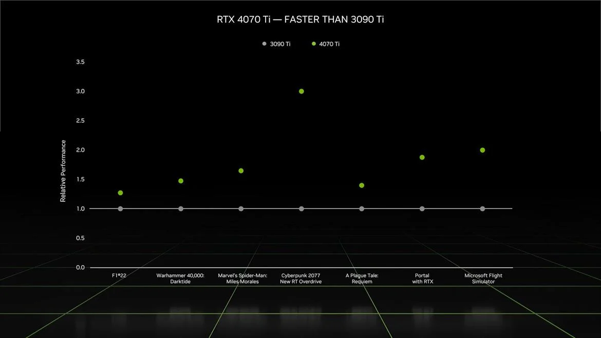 Всичко това означава 40 TFLOPS shader performance, 93 RT TFLOPS и 641 Tensor TFLOPS. Според NVIDIA потребителите могат да очакват GeForce RTX 4070 Ti като цяло да изпревари GeForce RTX 3090 Ti, което е доста привлекателно за цената от $799. И така, за да обобщим, GeForce RTX 4070 Ti вече е официален и ще стартира от $799. Що се отнася до наличността на дребно, той излиза на дребно само след няколко дни - на 5 януари 2023 г. NVIDIA няма да предлага модел Founders Edition. Вместо това можете да очаквате партньорите на NVIDIA да излязат с персонализирани модели, някои от които ще се придържат към референтните спецификации, а други ще включват фабрични овърклокове.