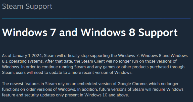 През 2018 г. Valve обяви, че вече няма да поддържа Windows XP и Windows Vista. Поддръжката за тези системи беше спряна през 2019 г. Днес Valve обяви, че вече няма да поддържа Microsoft Windows 7 и 8 от 1 януари 2024 г.: