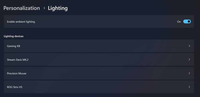 Бяха споделени някои екранни снимки от ранните компилации на Windows 11, които предполагат, че тази опция скоро може да бъде достъпна за компютърните геймъри. Нова опция за персонализиране ще се появи в менютата на Windows, за да контролира осветлението на външен хардуер, като клавиатура, мишка или слушалки.